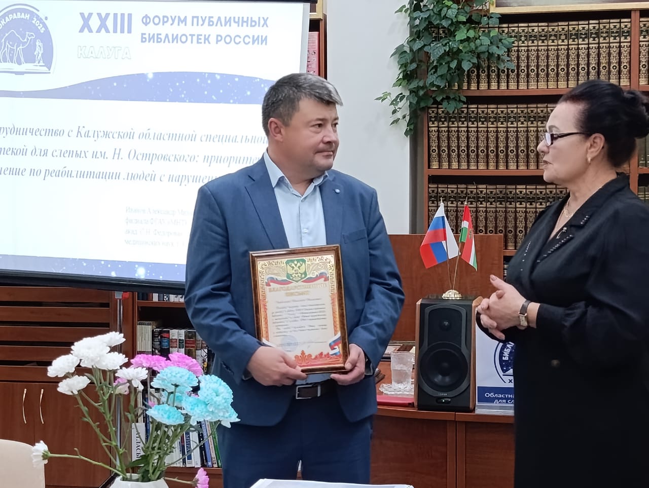 Директор Калужского филиала ФГАУ «НМИЦ «МНТК «Микрохирургия глаза» им. акад. С.Н. Федорова» Минздрава России, кандидат медицинских наук Александр Михайлович Иванов принял участие в секции «Новые возможности библиотеки в условиях СВО: взаимодействие с партнерами» в рамках ХХШ Форума публичных библиотек России «Библиокараван – 2025», проходившего в Калуге.