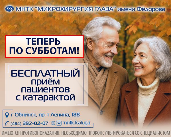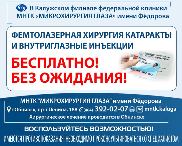 Калужский филиал МНТК «МИКРОХИРУРГИЯ ГЛАЗА» имени Фёдорова предоставляет жителям г. Обнинска полный спектр услуг, включая амбулаторную хирургию. Пациенты Обнинского отделения после хирургического вмешательства не нуждаются в стационарном лечении.