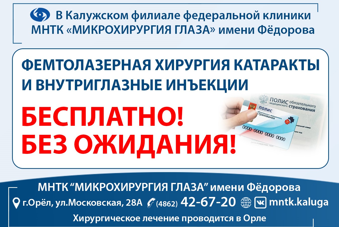 Высокотехнологичные операции по лечению катаракты и глаукомы проводятся в Орловском отделении в амбулаторных условиях. Это позволяет орловчанам не покидая родного города получать хорошее зрение от признанных профессионалов, по самым современным методикам, на высокотехнологичном оборудовании. Операции проводят ведущие хирурги Калужской клиники.Все выполняемые операции проводятся по самым современным методикам, под местным наркозом и, что важно, амбулаторно – пациенту нет необходимости оставаться в клинике. При этом врачи полностью контролируют процесс его реабилитации. Операции проводятся ведущими офтальмохирургами Калужского филиала.