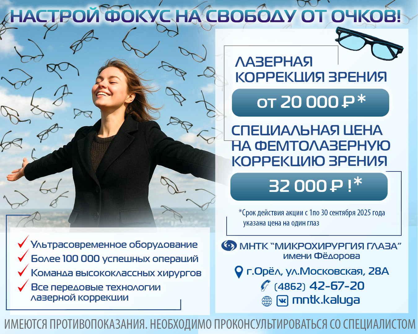 | Доктор | Приём ведёт Наталья Александровна Кондратьева, ведущий рефракционный хирург Калужского филиала МНТК. Приглашаются пациенты с близорукостью, дальнозоркостью, астигматизмом. |